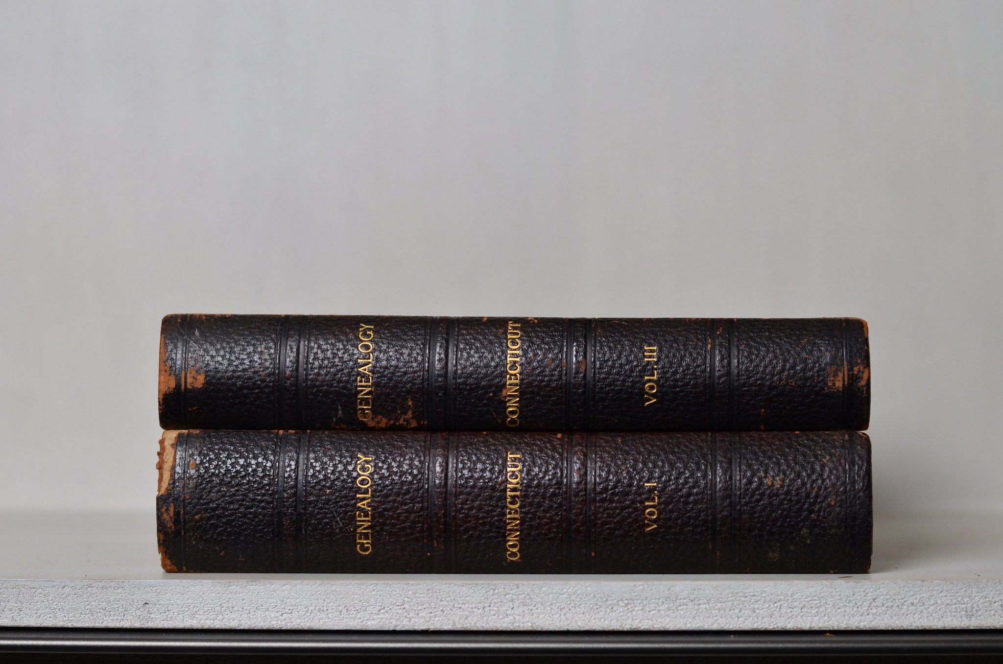 Dark Brown Antique Leather Book Set – 2 Oversized Books, Connecticut Genealogy